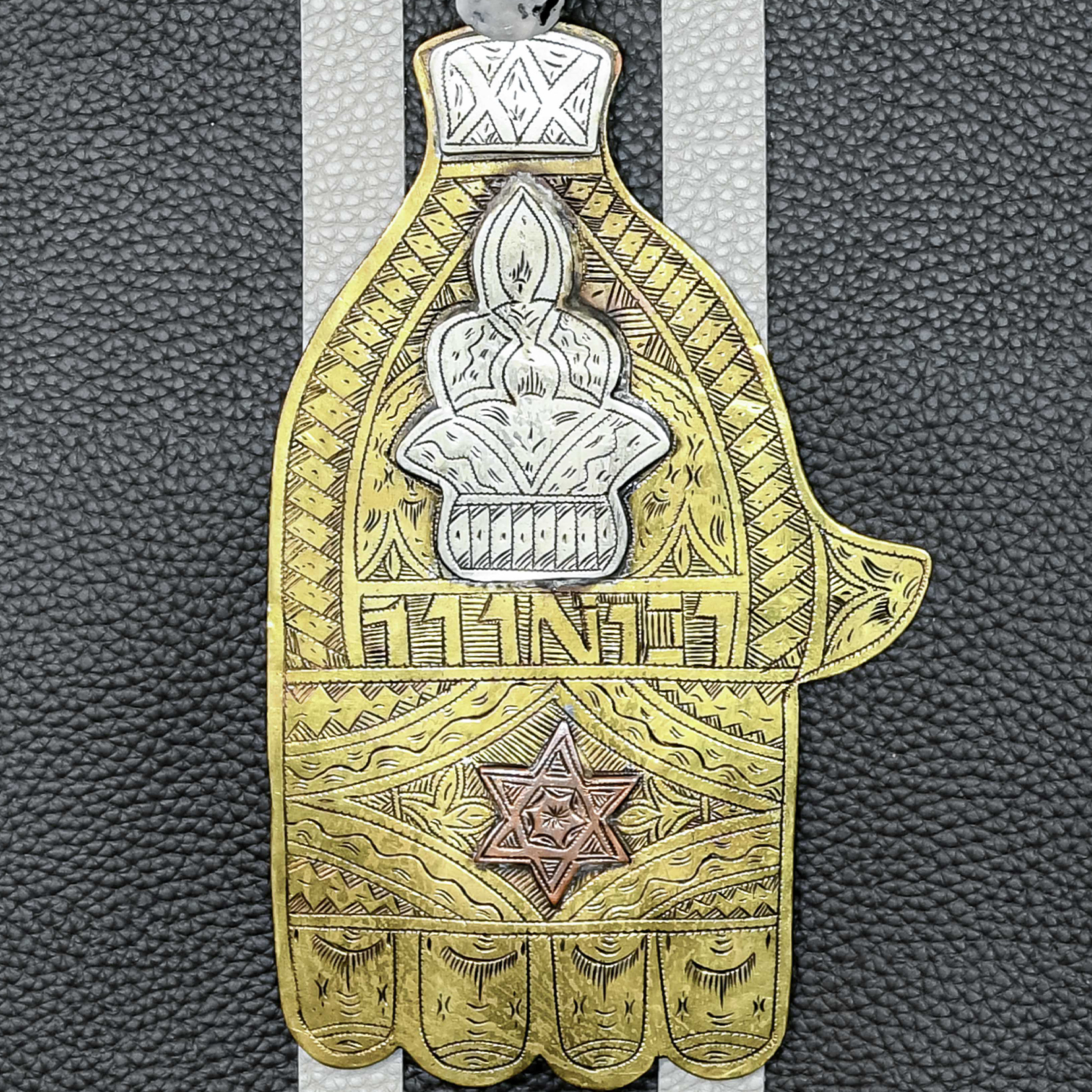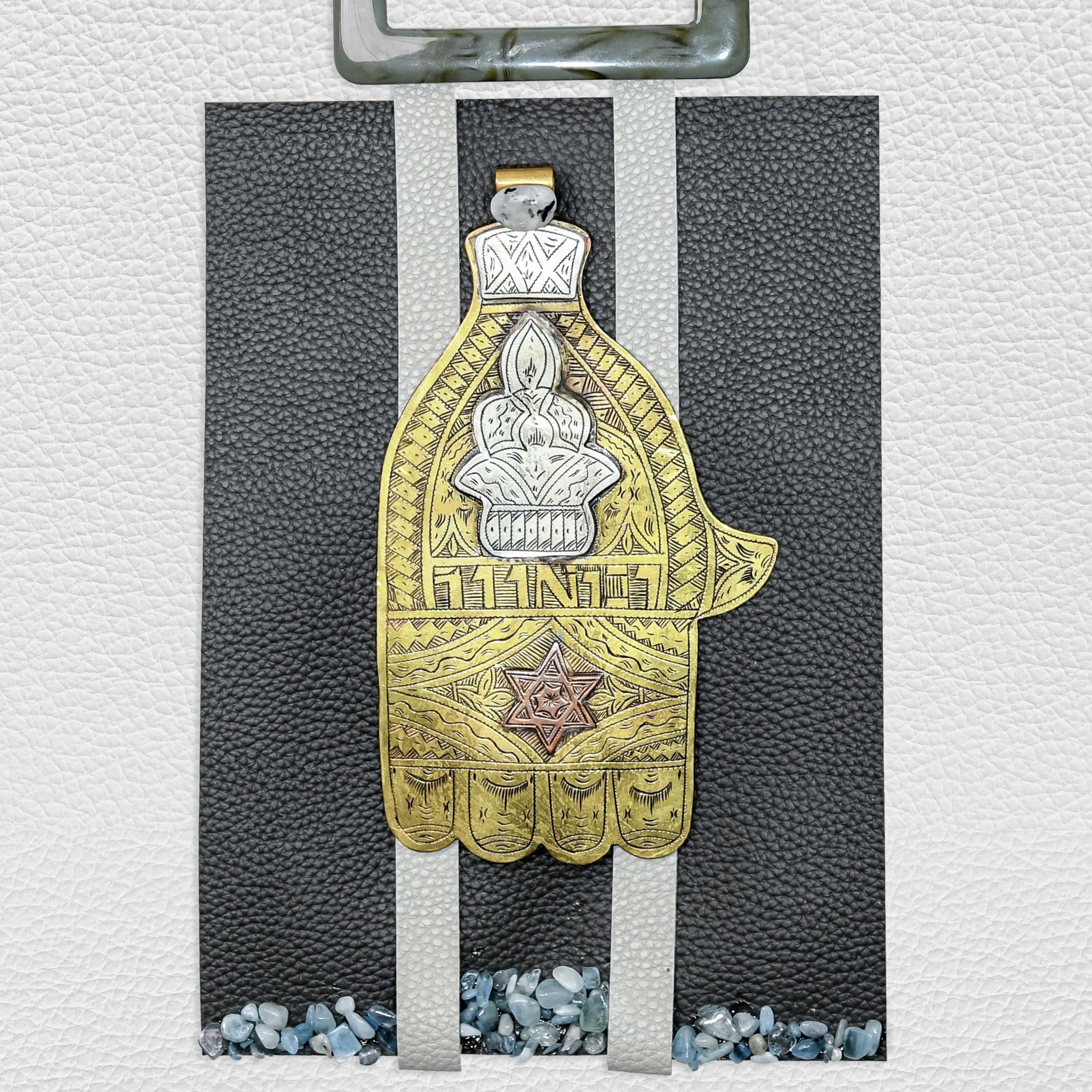כמות של חמסה צפון אפריקאית נדירה על גבי עור טבעי ושיבוץ אבני אקוומרין. מתלה פלסטיק דמוי קריסטל