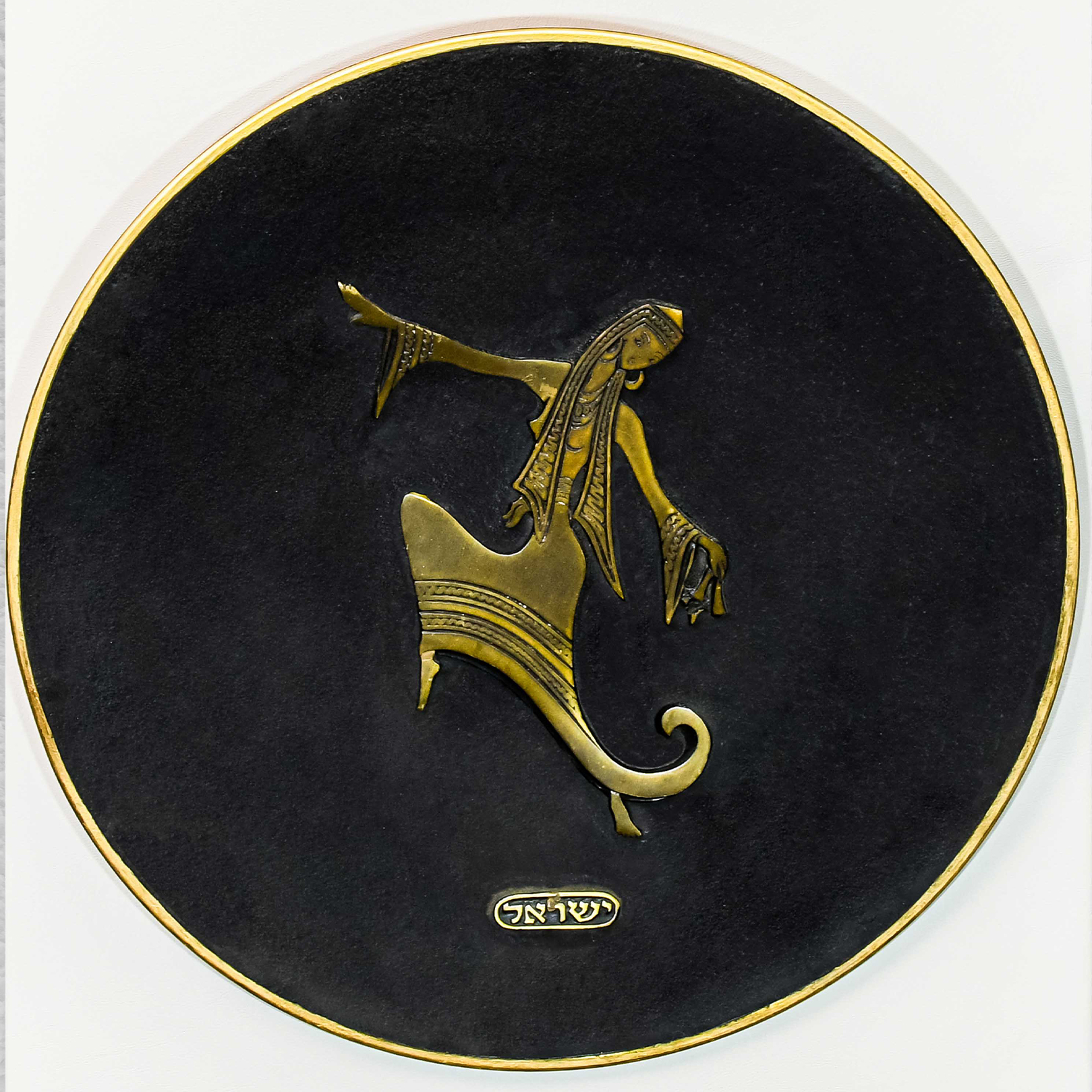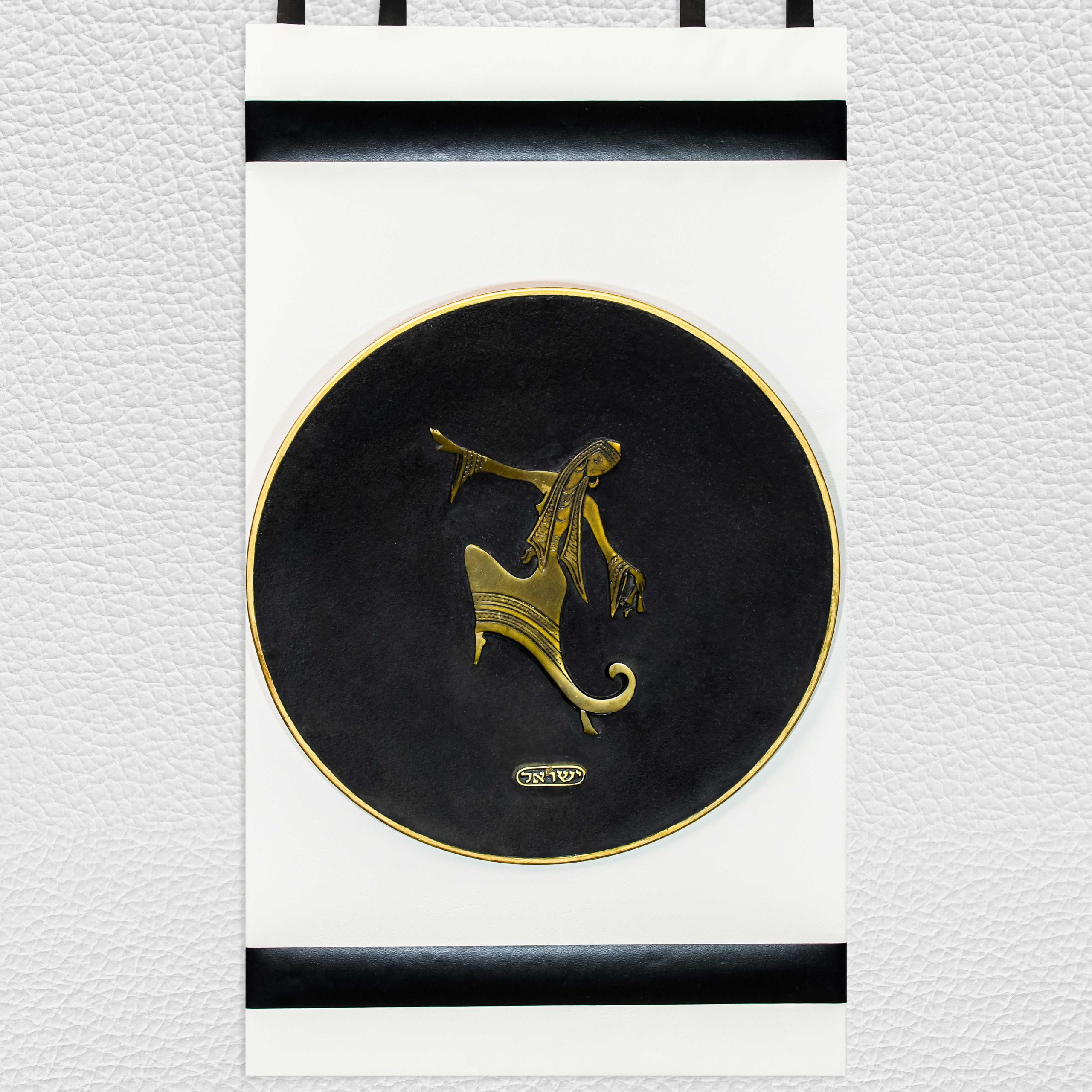 ישראלינה מיוחדת צלחת נחושת וקישוט פליז על אמייל, עם הכיתוב ישראל, משנות ה- 60, מולבשת על גבי עץ בחיפוי דמוי עור לבן