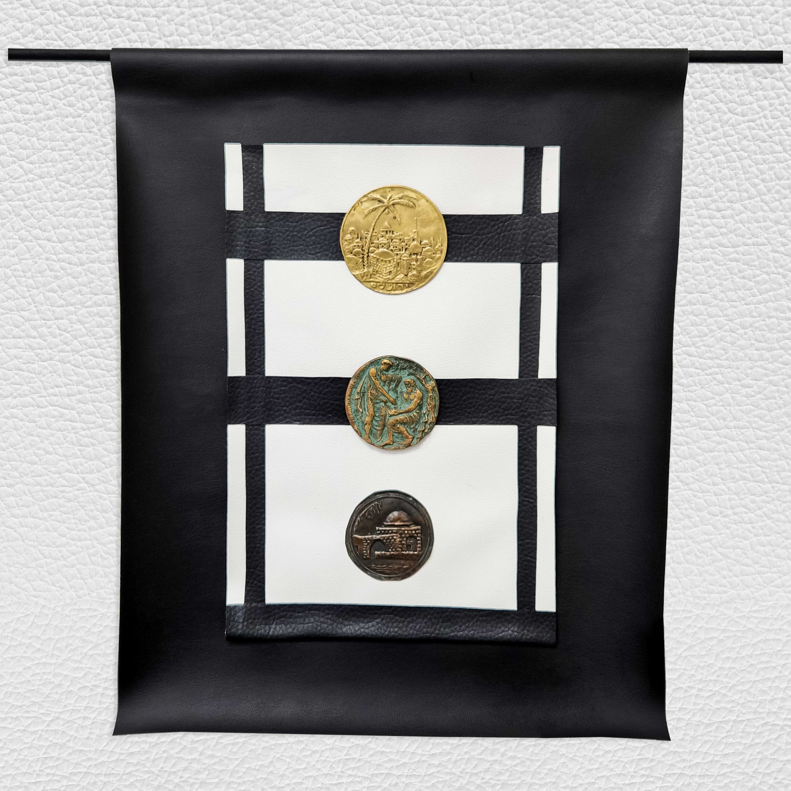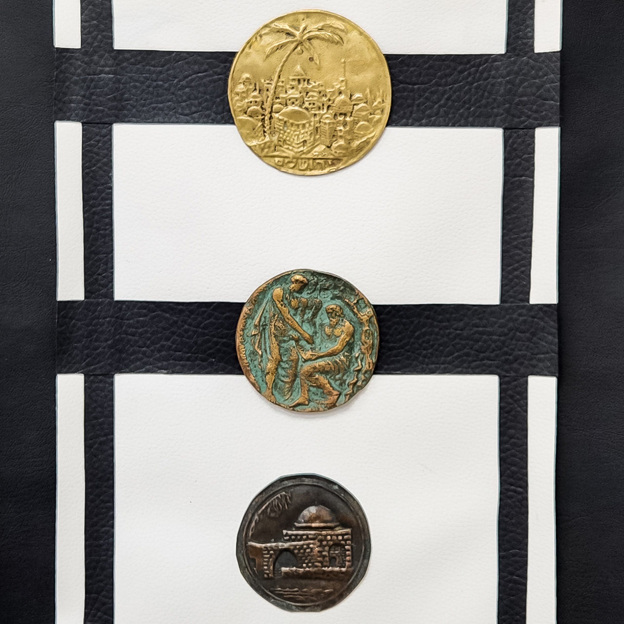 מדליה ברונזה וזוג תבליטי נחושת של קבר רחל וירושלים, מודבקים על גבי עור טבעי, מתלה דמוי עור