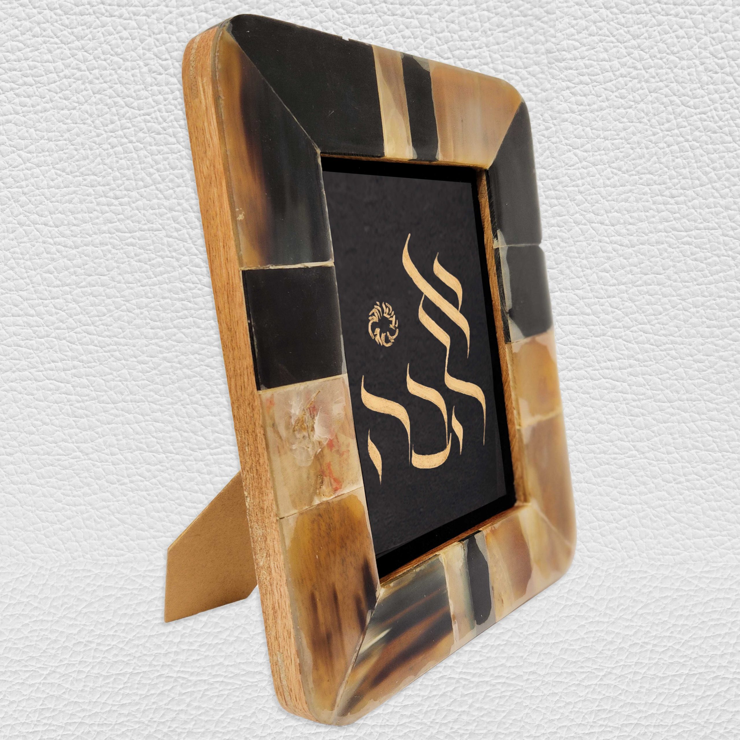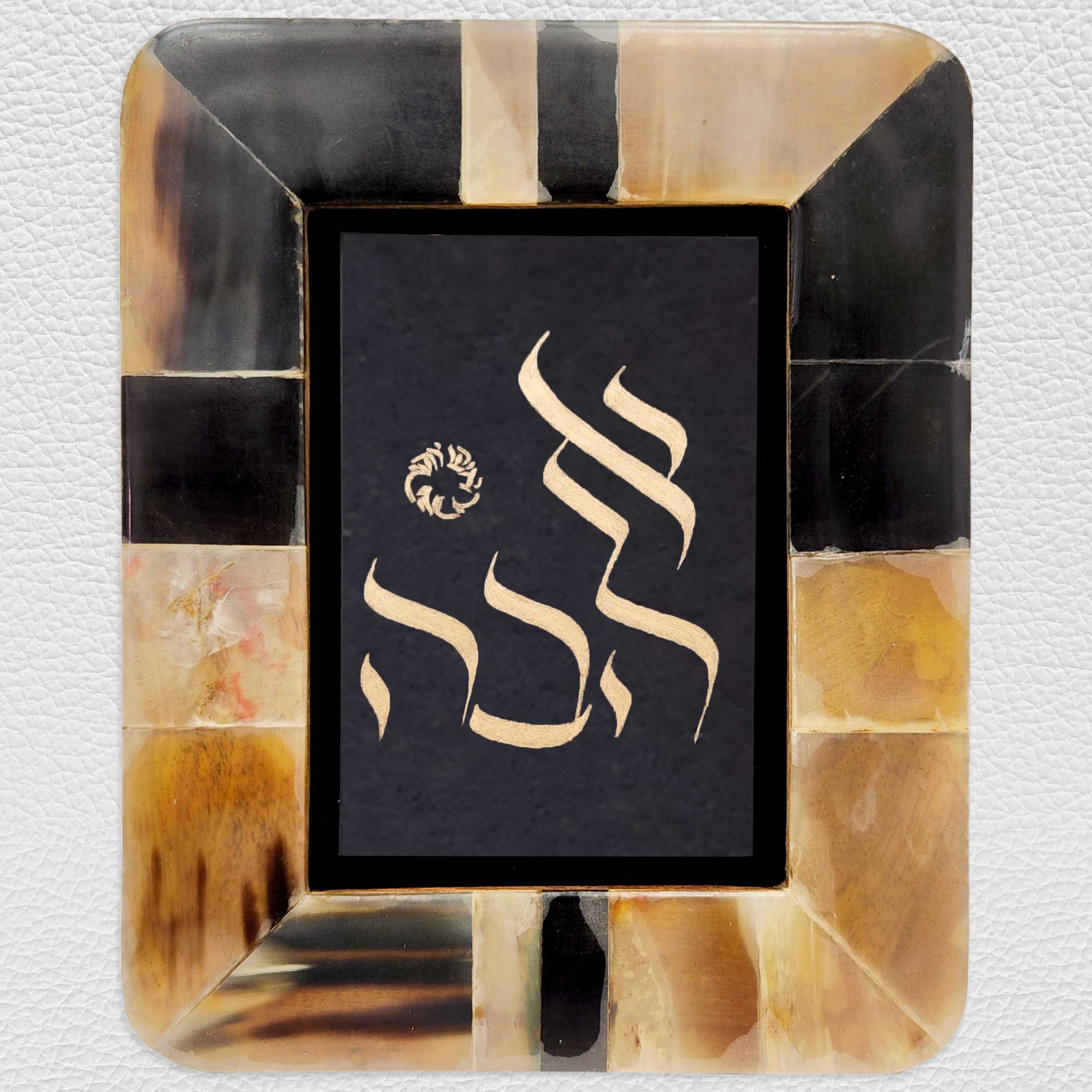 / תמונת "אהבה" כיתוב קליגרפי בדיו זהב על נייר דמוי עור שחור. מסגרת שרף